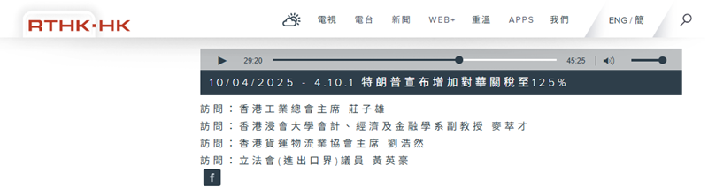 Media Interview with HAFFA Chairman - 【千禧年代】特朗普宣布增加對華關稅至125% (香港電台)