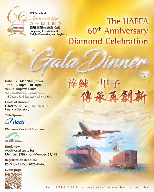 Members are welcome to invite non-HAFFA business partners to join the celebration and share in the spirit of this special occasion. Non-member companies must be referred by a HAFFA Member in order to register, and their business nature must be related to the freight and logistics industry. The Association reserves the right to review and decline any registration without providing a reason. For registration details, please contact the HAFFA Secretariat. |