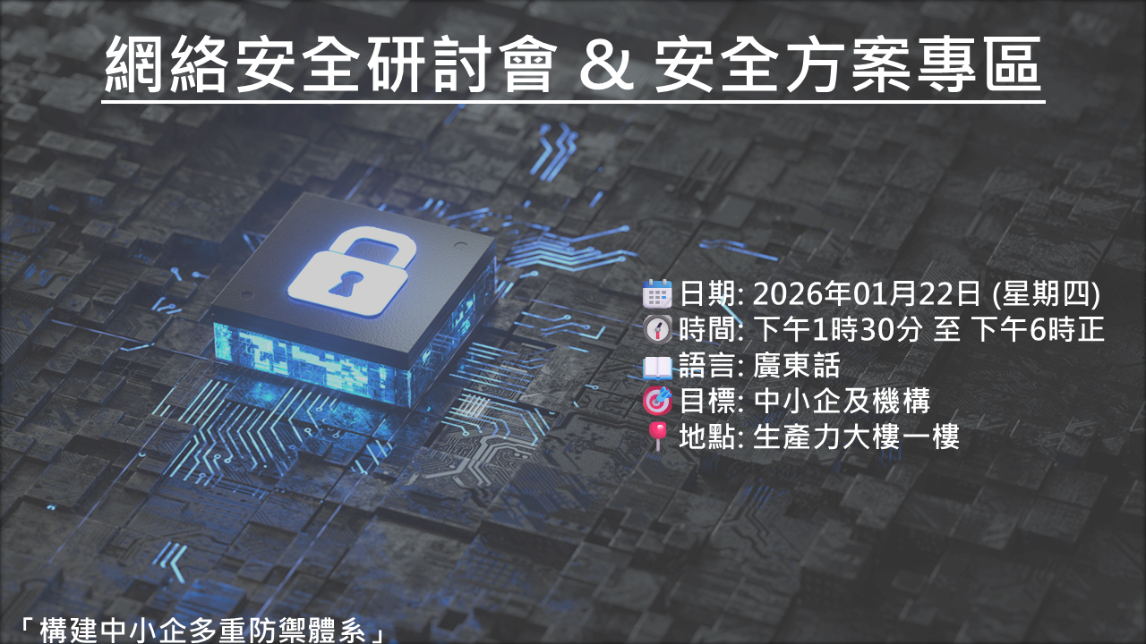 活動詳情:請瀏覽 https://www.hkcert.org/tc/event/building-a-multi-layered-defense-system-for-smes-cybersecurity-seminar-and-solutions-hub