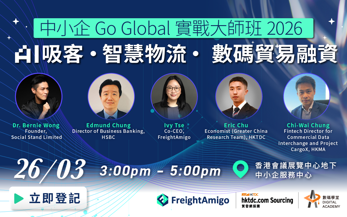 參加者可即場發問,與專家現場交流及聽取專業意見,亦可於會後與業內人士及到場專家交流分享。本次活動為實體研討會,不設網上直播。現場座位有限,成功報名者將獲發確認函通知。 | | 日期 | 2026年3月26日(星期四) | | 時間 | 15:00 – 17:00 | | 語言 | 廣東話 | | 形式 | 現場參與 | | 地點 | 香港會議展覽中心地下中小企服務中心 | | 內容 | ・2026 中小企必知 AI 出海趨勢 ・AI 快速發掘海外買家技巧 ・關鍵國際數據解讀 ・如何用 AI 智能平台掌握國際物流 ・現金流與資訊流策略 ・跨境金流新趨勢 | | |  | Ivy Tse FreightAmigo 聯合首席執行官兼創辦人 | | 謝凱澄女士擁有超過 15 年在《財富》全球 100 強企業中的區域管理專業知識。她的專業範疇涵蓋資訊科技、雲服務和物流等領域。她卓越的職業生涯以項目管理、客戶實施和合規性方面的領導能力為特點。近年來,她專注於數碼化國際物流和貿易融資科技項目的發展。作為一位創業家,謝女士榮獲 2021 年德勤-香港高科技高成長女性獎及第四屆金紫荊女企業家獎等殊榮。自2022 年以來,她擔任香港物流發展局委員,致力於促進科技創新和推動香港物流生態系統的可持續增長。此外,她為現任香港工業總會第 21 分組運輸與物流業協會主席及香港工業總會青年委員會副主席。為業界的未來注入科技為新動力,引領嶄新發展方向。 | | |  | Dr. Bernie Wong Social Stand Limited創辦人 | | 黃啟亮博士(Dr Bernie Wong)為 Social Stand Limited 創辦人及企業數碼營運顧問,擅長AI應用、海外及本地的市場洞察,亦擁有逾15年品牌形象策略經驗。 他對國際市場有深刻理解,曾為 Marks & Spencer、GAP、Adidas、Disney 等《財富》500強,及國際品牌策劃內容及形象策略,專長以品牌故事連結目標受眾,放大品牌影響力。 同時,他活躍於本地及海外市場培訓與研討會,分享中小企 AI 應用、品牌數碼化及實戰案例,協助企業在新世代重塑品牌形象與市場競爭力。 | | |  | Eric Chu 香港貿發局經濟師 (大中華區研究團隊) | | 朱德軒(Eric Chu)主力研究中國內地及香港市場發展,並深入分析多個產品及服務行業,包括加工食品及飲料、葡萄酒,以及創新及科技、資訊及通訊科技與管理諮詢等。 | |  | Chi-Wai Chung 香港金融管理局(HKMA)金融科技總監 | | 智偉為現任香港金融管理局(HKMA)金融科技總監,負責商業數據通(Commercial Data Interchange, CDI)數據基建及 Project Cargox相關項目。這些開創性計劃以數據為基礎,優化貿易融資及文件傳輸流程,致力構建安全、高效的數碼貿易融資生態環境,促進銀行與企業之間的金融科技應用與創新,提升企業(尤其是中小企業)貿易融資效率,以鞏固香港在全球數碼貿易基建領域的領導地位。 | |  | Edmond Chung 滙豐銀行香港工商金融總監 | | 鍾學良現任滙豐銀行香港工商金融總監,負責推動滙豐香港中小企業務的策略和發展,全方位配合客戶所需,並提供多元化銀行方案,實行滙豐支持香港初創和中小企的承諾。 鍾先生於滙豐工作逾20年,在工商金融業務方面擁有豐富經驗,包括客戶與市場策劃、培訓管理及人才發展、風險及控制管理,並曾出任不同的管理層職務,致力推動企業在本地和國際上拓展。 | | | | 香港貿發局主辦「數碼學堂」(Digital Academy),邀請各方面的網上推廣專家,為你提供全面而實用的免費數碼營銷培訓課程,從網絡行銷到電子營商秘訣都一應俱全,讓中小企就算從零開始,也能隨時隨地自學並增進各種不可或缺的數碼知識。 | | | | 支持單位 | | |  | | | | | 您收到香港貿發局服務推廣訊息,因為本局的公司資料庫載有您的聯絡資料。此電郵地址僅供發放消息之用,請勿回覆此電郵。如對此電郵內容有任何查詢,請電郵至 supplier@hktdc.org 拒絕接收推廣信息或更新您的香港貿發局電郵訂閱,請按 此處 。 | | |