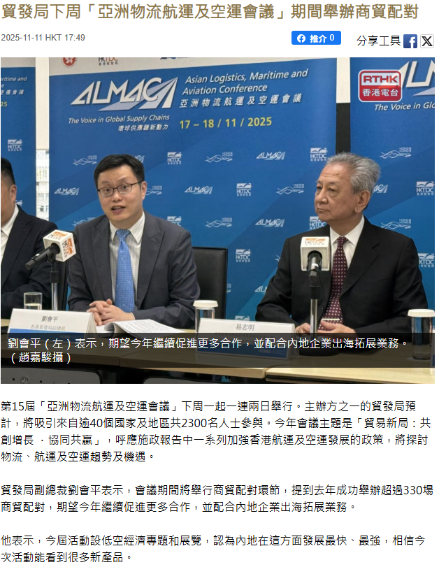 貿發局下周「亞洲物流航運及空運會議」期間舉辦商貿配對