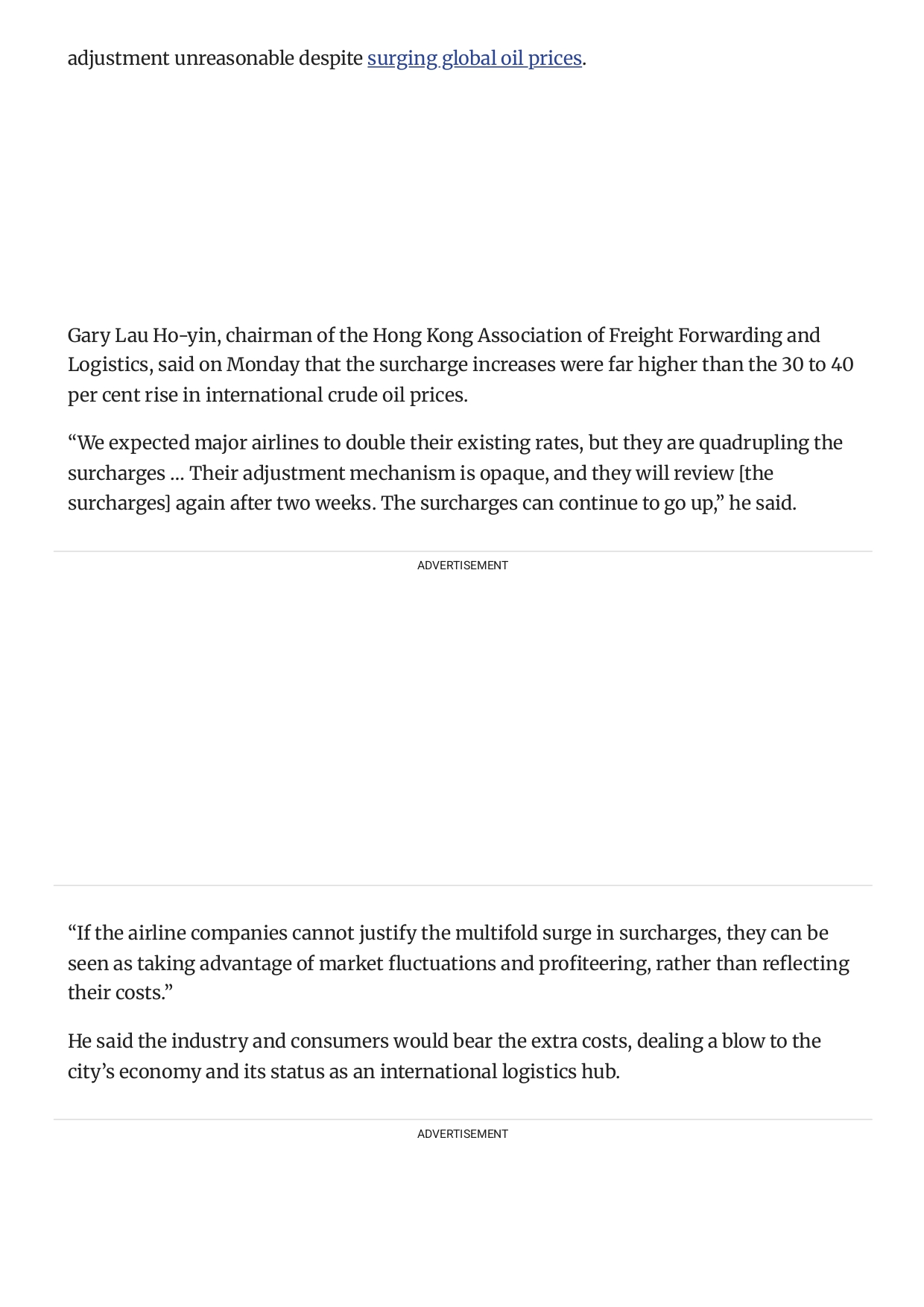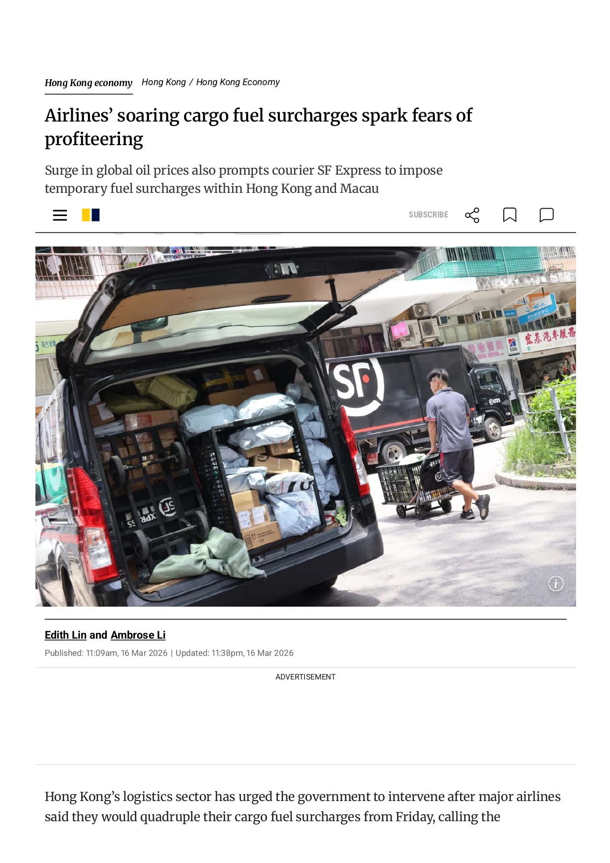 Media Interview with HAFFA Chairman - Airlines’ soaring cargo fuel surcharges spark fears of profiteering (South China Morning Post)