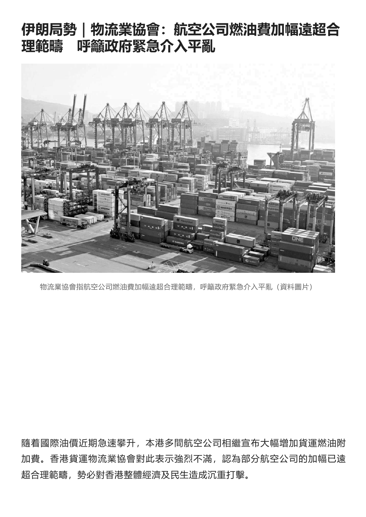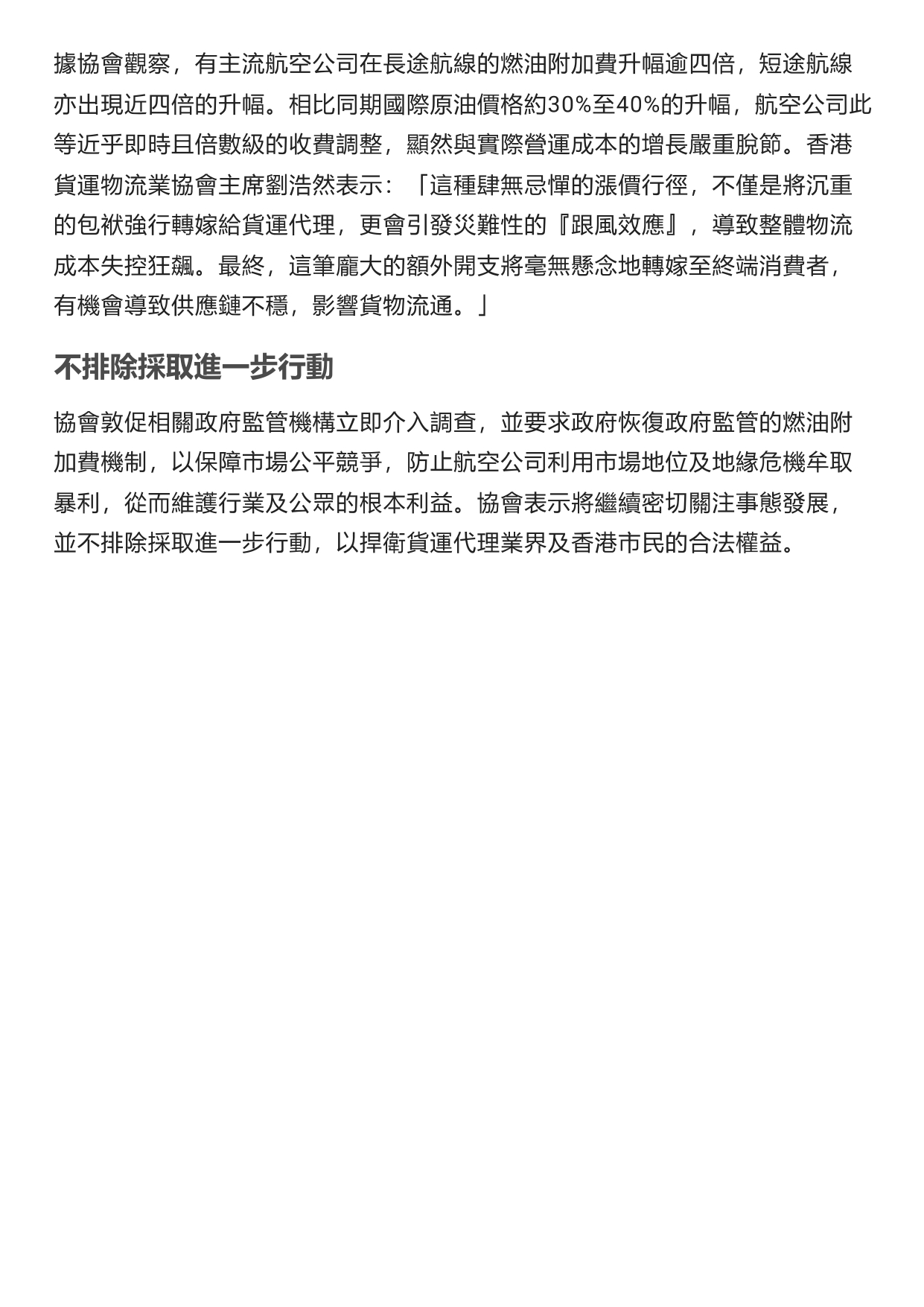 物流業協會:航空公司燃油費加幅遠超合理範疇 呼籲政府緊急介入平亂